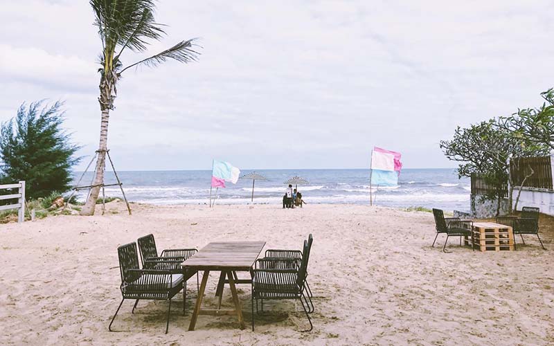 พื้นที่ในส่วนของคาเฟ่ที่อยู่ชั้นล่าง เป็นแบบโอเพ่นแอร์ มีที่นั่งทั้งภายในตัวร้าน และบริเวณหน้าหาด รวมถึงพื้นที่ชั้นสองครึ่งหนึ่งเป็นส่วนของคาเฟ่ แต่งแบบมินิมอล จัดเป็นที่นั่งบนเบาะและโต๊ะญี่ปุ่น หน้าต่างเป็นกระจกมองเห็นวิวทะเล